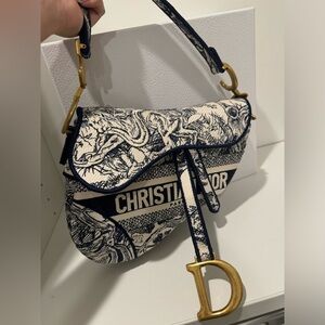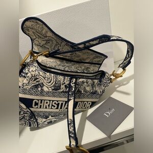 This is an authentic CHRISTIAN DIOR Canvas Embroidered Toile de Jouy Saddle Bag in Blue. This saddlebag is made of Dior monogram canvas with all-over jungle animal embroidery. It features an exterior rear patch pocket, a leather looping handle and brass hardware. The flap opens to beige canvas interior with a zipper pocket.