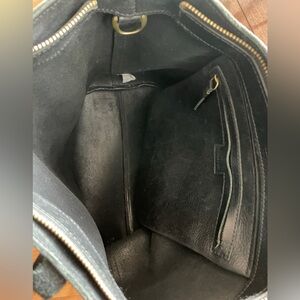 Sleek black leather tote. Spacious interior with zippered hanging pocket and zippered closure. One slide-in exterior pocket. Dual handles.