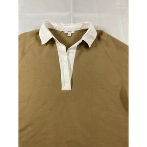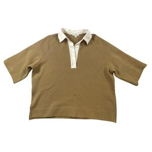 Relaxed-fit polo sweatshirt crafted from a soft, structured jersey fabric in a versatile camel tan hue. This modern take on the classic rugby shirt features a contrasting white twill collar and a deep buttonless placket for an effortless, open neckline. Designed with raglan sleeves that hit at the elbow and a slightly cropped, boxy silhouette with side slits at the hem, it offers a sophisticated yet sporty aesthetic. Perfect for elevated loungewear or paired with tailored trousers for a polished casual look.