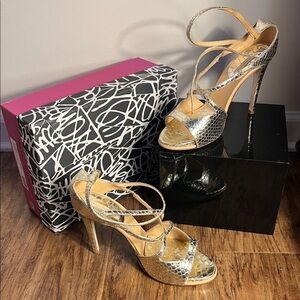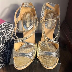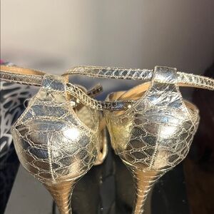 Shimmering metallic gold heels with strappy design. Perfect for a chic look.