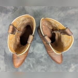 Stylish brown leather cowboy boots featuring intricate embroidery. Perfect for a classic western look.