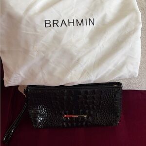 Chic Brahmin clutch with crocodile embossing. Features tan and pink hues. Stylish and versatile.