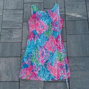 Lilly Pulitzer Lets Cha Cha Turquoise Delia Shift Dress Pink Blue Size 2 Holy Grail. Lined, zipper back. No bows on back hem. Preloved in great condition