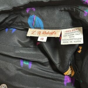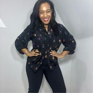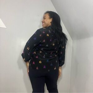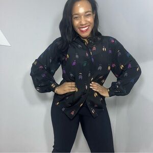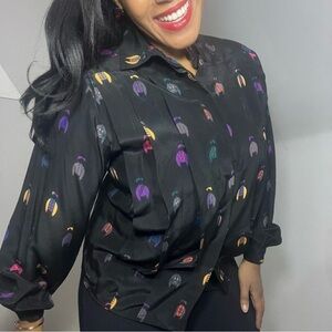 Vintage silk button down blouse black boy silhouette graphic AOP artsy retro fun