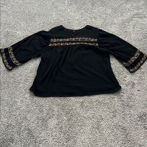Flowy boho black piece from J. Jill. Versatile and timeless. This top features a single back button at the neck and beautiful embroidery on the front, back and sleeves. Machine washable.
