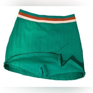 Chic knit sports top and skorts with a teal body and pink trim. Ideal for on the court or everyday wear. Medium top. Large bottom that fit more closely like a medium. Stretchy materials.