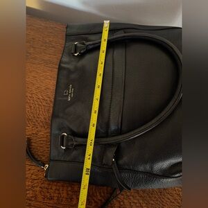 Classic Kate Spade New York black leather tote featuring pebbled leather, gold-tone hardware, and structured silhouette. Timeless everyday bag with top zip closure and dual shoulder straps. Clean interior with signature Kate Spade patterned lining and interior zip pocket for organization.