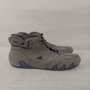 The LDeck Italian Suede Boots are high-top men's casual shoes made of leather with a solid gray color and a hook & loop closure. These boots feature a comfortable and breathable design with a lightweight construction, making them suitable for various occasions such as activewear, casual outings, and workwear. The leather upper material and polyester lining ensure durability and quality, while the adjustable features and standard shoe width provide a comfortable fit. Perfect for all seasons, these athletic sneakers are a stylish and versatile option for men looking for a combination of style and functionality in their footwear.