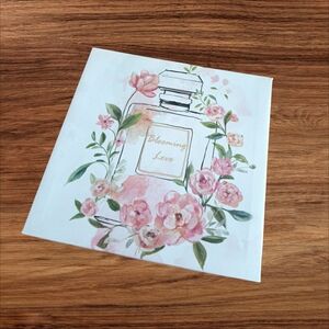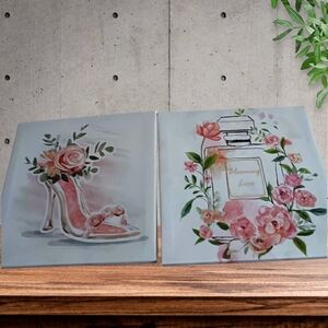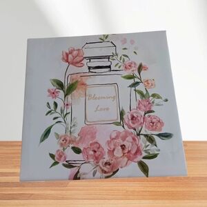 Description: Set of 2 Canvas of Pink Botanical Perfume Bottle design and Heel Shoes with Pink Roses around them, has the words Blooming Love on one of the Artwork. Frame is Square and size is 8x8in.