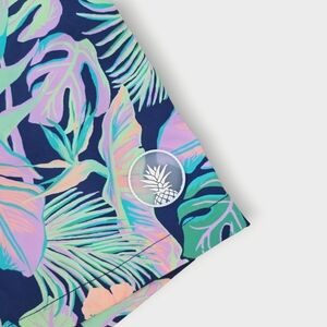 Vibrant swim shorts with a tropical leaf pattern. Features shades of blue, green, and pink.