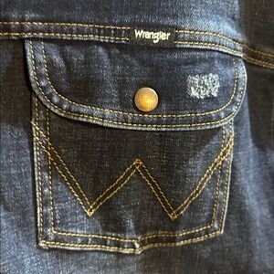 Classic Wrangler denim jacket. Dark blue with button closure. Features front pockets and signature stitching.