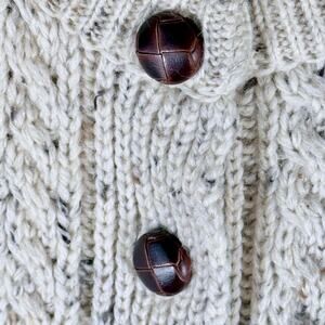 This handsome sweater features a cable knit pattern, pockets, and wooden buttons. It has a round collar that buttons all the way up.