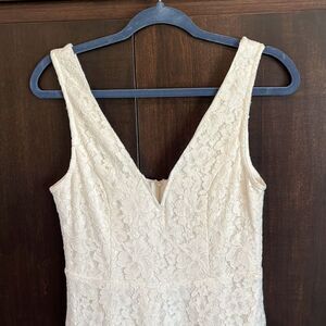 This dress is made by Lulus. It’s a white lace with a back zipper. Size large and in nice pre owned condition. Smoke and pet free home.