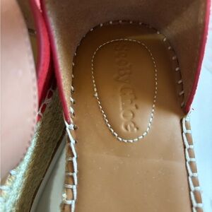 Stylish espadrilles with red suede upper. Tan ankle strap with buckle. Comfortable platform sole. Great condition!! 💯 authentic!