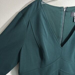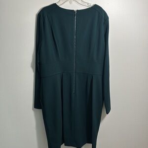 This DKNY dress features a sophisticated pine hue, perfect for work or cocktail occasions. Designed with a flattering V-neckline and long sleeves, it offers a sleek sheath silhouette that exudes elegance and style. Its minimalist design makes it a versatile addition to any wardrobe.