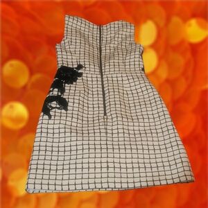 Betsey Johnson Floral-Applique Sheath Dress show its fitted silhouette and how the floral lace appliqués frame the black-and-white grid pattern. These professional images highlight the dress as a knee-length or mini style, often paired with simple black heels for a classic, sophisticated look.