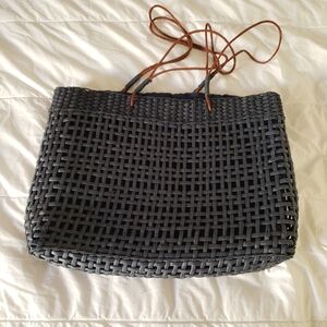 This elegant handcrafted tote bag features a beautiful brown and tan woven with leather handles design.Perfect for any occasion, it combines style and functionality,great condition.