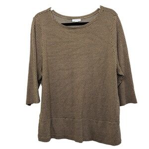 Classic J. Jill relaxed fit tunic featuring a camel and black micro geometric print. Lightweight knit with 3/4 sleeves and an easy drape silhouette. Perfect for office casual, travel wear, or capsule wardrobe layering.