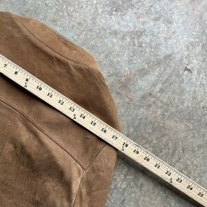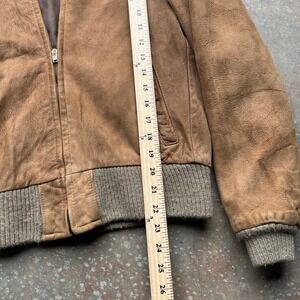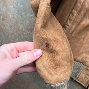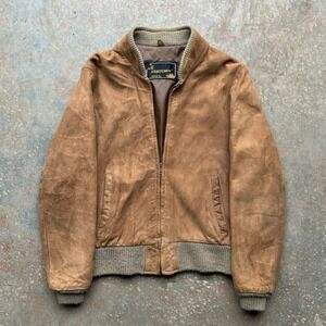Vintage Startown bomber jacket crafted from genuine leather with a soft suede-like texture in a rich tan brown. This classic outerwear piece features a full-zip front, ribbed knit collar, cuffs, and hem for a comfortable, secure fit. Designed with a clean silhouette, it includes two diagonal welt pockets and a smooth interior lining. The jacket shows a timeless rugged aesthetic, perfect for layering in cooler weather. Please note a small dark mark on the lower sleeve as shown in the detail photos.