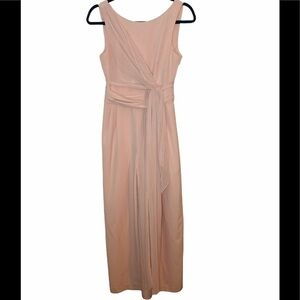 Eliza J blush pink wide leg jumpsuit, new without tags, may have some marks at bottom of dress from being tried on at the store, wrap bodice bust, zip back closure, wide trouser pants, 88% polyester, 12% elastic