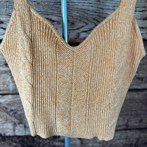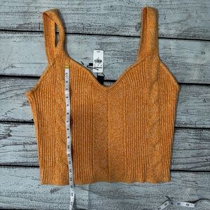 Stylish orange crop top with cable knit design. Features a flattering V-neck and wide straps. Perfect for layering or wearing alone.