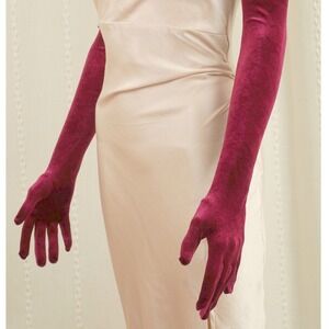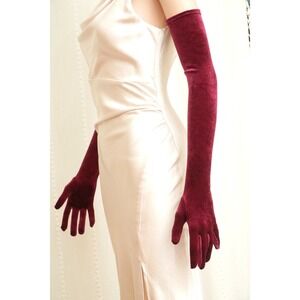 Elegant extra long opera length gloves (16BL) crafted from a rich, deep burgundy velvet fabric that offers a luxurious sheen and a comfortable stretch fit. These evening gloves reach above the elbow, providing a sophisticated silhouette perfect for formal galas, weddings, or vintage-inspired costumes. The soft texture and vibrant wine-colored hue add a touch of Old Hollywood glamour to any sleeveless or short-sleeved ensemble.