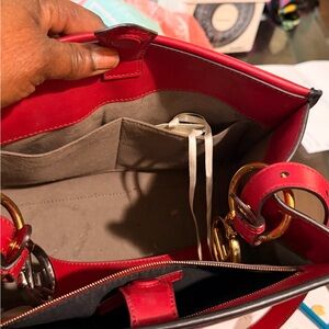 Fendi shoulder bag in red and black leather, designed as a satchel and crossbody. Features black trim and gold-tone hardware. Stylish and versatile.