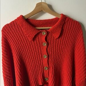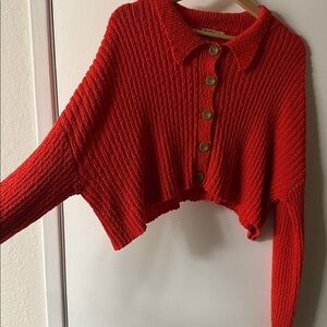 cropped cardigan. size S. vibrant red/orange button-up sweater with a soft ribbed texture