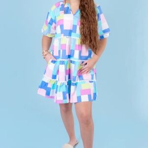 The dress is characterized by its colorful, block-patterned print and tiered silhouette,