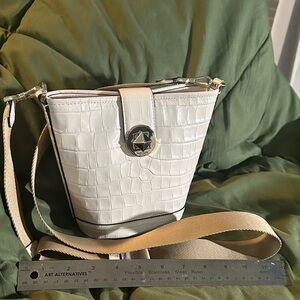 Beautiful condition measures 12 x 10” with a strap drop of 24 inches. No damages of any kind brown materials nylon black is black leather has removable strap no dust bag sorry.