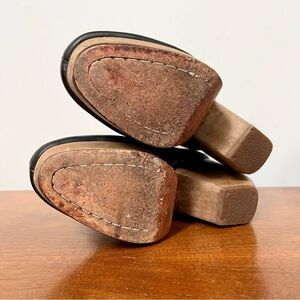 Rachel Comey Petra wooden heel leather ankle boots! Beautiful black leather exterior w/ stacked curved wooden heel w/rounded profile, 4” high w/nonslip tread with 1” platform. Size 6.5. Zip side entry with stretch panel. Rounded toe. Gently used in excellent overall condition, comes with dust bag but no box. Please see all pics for wear. For fans of geometric shoes from: loq, Paloma wool etc