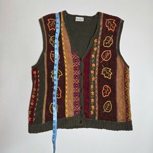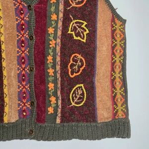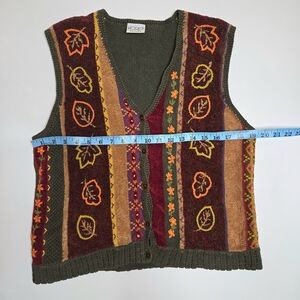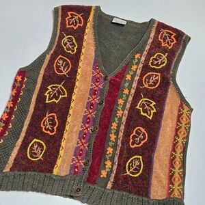 Vibrant vest with leaf patterns. Features shades of red, orange, and brown.