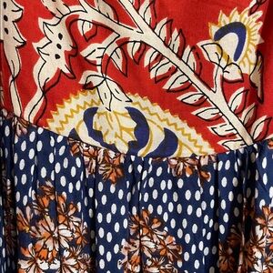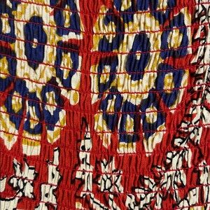 Chic boho dress with red and blue floral patterns. Ideal for casual outings. Looks really cute either way a denim vest. Adjustable straps, smocked back for comfortable fit. And it has pockets!!