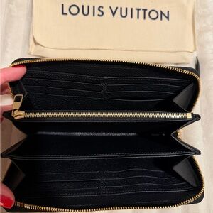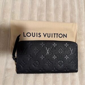 Chic black wallet with embossed monogram pattern. Secure zip closure.