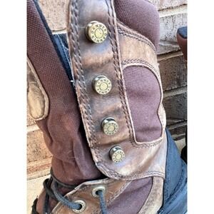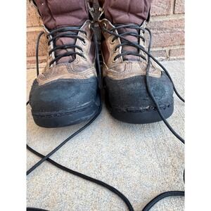 Danner Gore-Tex hunting boots offer a rugged combination of leather and durable textile uppers in a versatile brown and black colorway. Designed for demanding outdoor environments, these high-top boots feature a waterproof Gore-Tex lining to keep feet dry and a lace-up closure with speed hooks for a secure, adjustable fit. The reinforced toe and heel caps provide extra protection against rough terrain, while the cushioned midsole and lugged outsole ensure stability and comfort during long treks.
