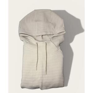 Comfortable beige ribbed hoodie sweatshirt featuring a drawstring hood. Soft fabric with subtle horizontal ribbing detail. Perfect for casual wear and layering.