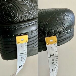These are black tooled Dansko clogs for women. Designed with slip-on closure and round toe shape. Mid heel style elevates your overall look.