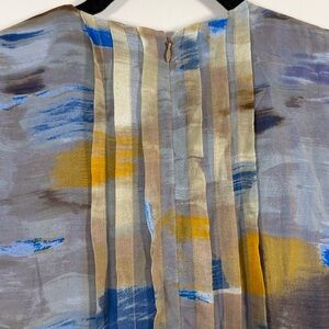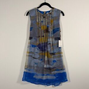Chic Calvin Klein mini dress with abstract patterns. Features blue, gray, and yellow hues. Perfect for versatile styling.