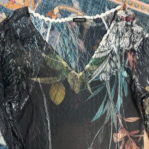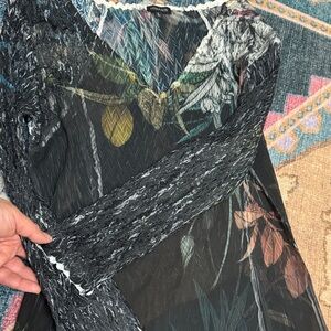 Komarov Chic black dress with lining floral patterns. Features long lace sleeves. Flowing and elegant design