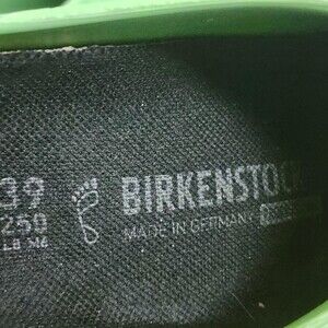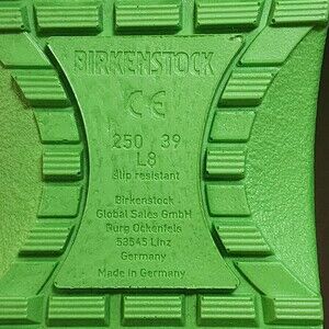 Identifiers: Sole stamped 250 39 L8, slip resistant, Made in Germany, Birkenstock Global Sales GmbH.