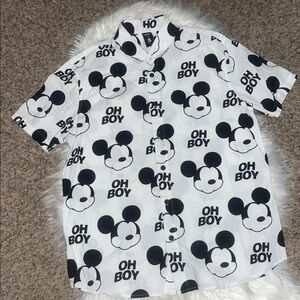This playful shirt features a fun Mickey Mouse 'Oh Boy' design. Perfect for any Disney fan, it combines comfort with style in classic black and white. Size is small, will fit a teen. Pit to pit 21.5”, shoulder to shoulder 17.5”, sleeve length 8.5”, and length is 27”.