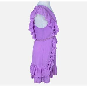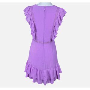 Elegant lavender dress featuring delicate pleated ruffles and intricate lace trim, designed for sophisticated evening events with feminine silhouette and flowing layers.