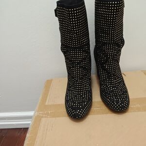 Elegant boots with gold stud detailing. Features three buckles. Ideal for a chic look.