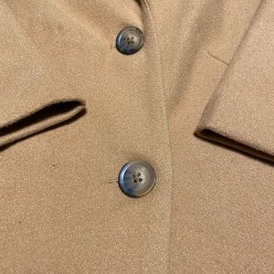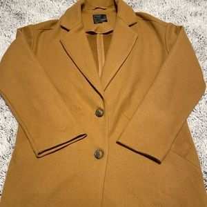 Stylish tan trench coat by Dynamite. Features a classic design with a single button closure. Perfect for layering.