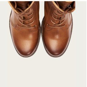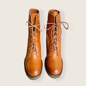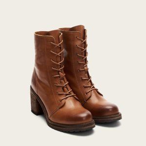 Frye Karen Cognac Leather Combat Lace Up Combat Wood Block Heel Ankle Boots