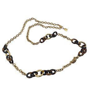 A sophisticated two-toned necklace combining gold-tone metal chain links with tortoiseshell-inspired dark brown circular links, creating an elegant and versatile accessory for layering or statement wear.