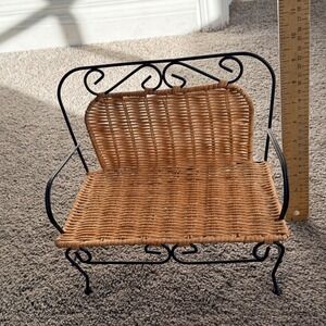 Vintage-style miniature loveseat features a charming combination of a black wrought iron frame and a woven wicker seat and backrest. Intricate scrollwork detailing on the back and front apron adds a touch of French Country or Victorian flair, making it an ideal decorative piece for doll displays, plant stands, or shelf decor. The sturdy metal construction ensures durability while the natural wicker texture provides a warm, rustic aesthetic.