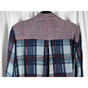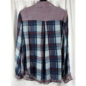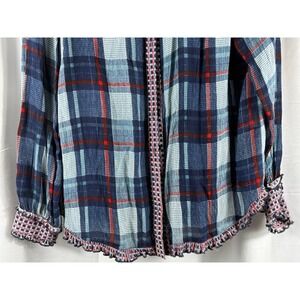 Bila Women's Plaid Long Sleeve Button Up Shirt Ruffle Trim Blue Red Large