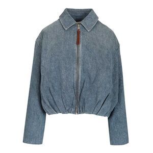 Draped denim jacket from Loewe, featuring a balloon silhouette and asymmetrical hand-gathered draping on the back, regular fit, cropped design, classic collar, front zip fastening, seam pockets, internal welt pocket and leather patch with embossed LOEWE lettering on the back.
