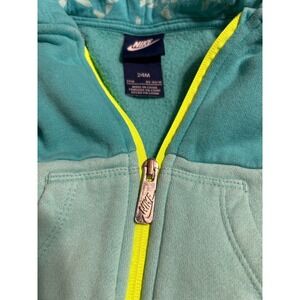 Wrap your little one in vibrant style with this adorable Nike color-block hoodie. The eye-catching teal and mint green combination, accented by a bright neon yellow zipper, makes this jacket a fun and playful addition to any toddler's wardrobe. The soft fleece interior provides cozy warmth, perfect for chilly mornings or playful afternoons at the park. The classic Nike logo proudly adorns the chest, showcasing athletic flair. Ideal for everyday wear, outdoor adventures, or casual outings. Pre-love, good condition. Some paint on sleeve shown in last photo.